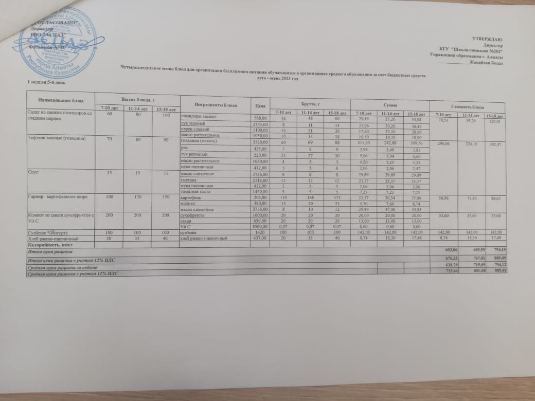 2023-2024 оқу жылындағы 6-қазан ас мәзірі » №202 жалпы білім беретін мектеп