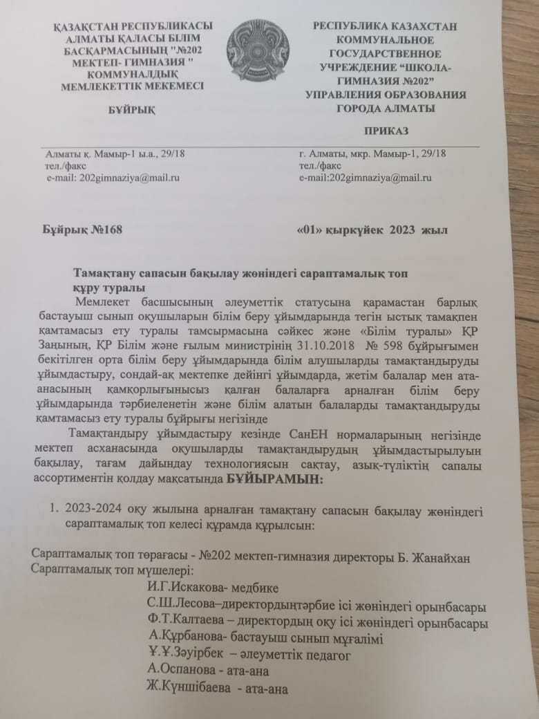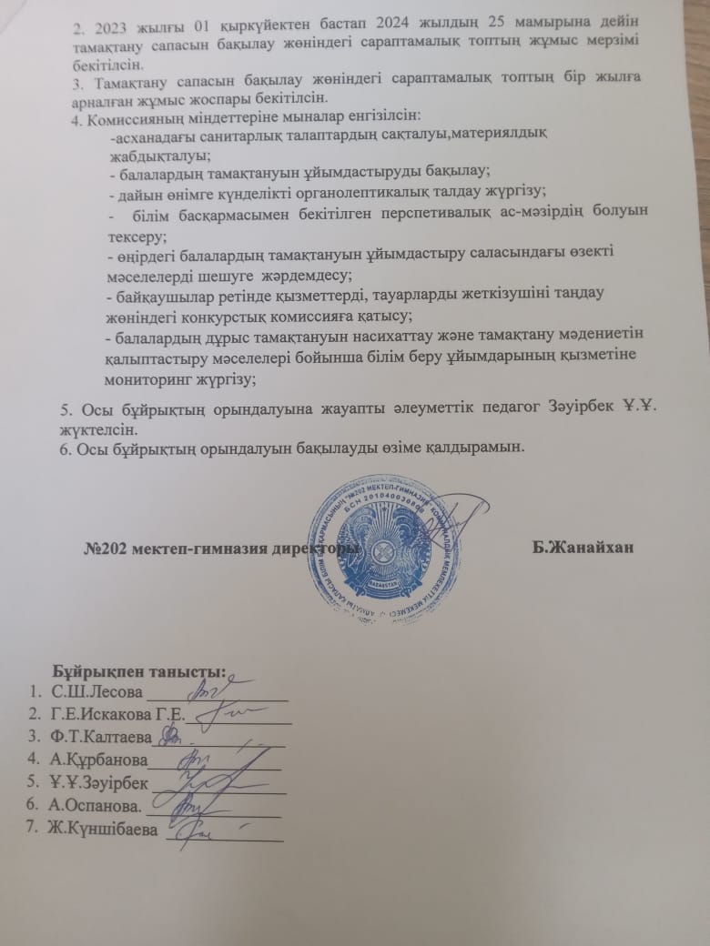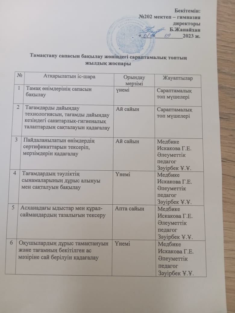 01 сентябрь 2023 0 1 2 3 4 5 2023-2024 оқу жылындағы "тамақтану сапасын бақылау жөніндегі сараптамалық топтың" жылдық жоспары