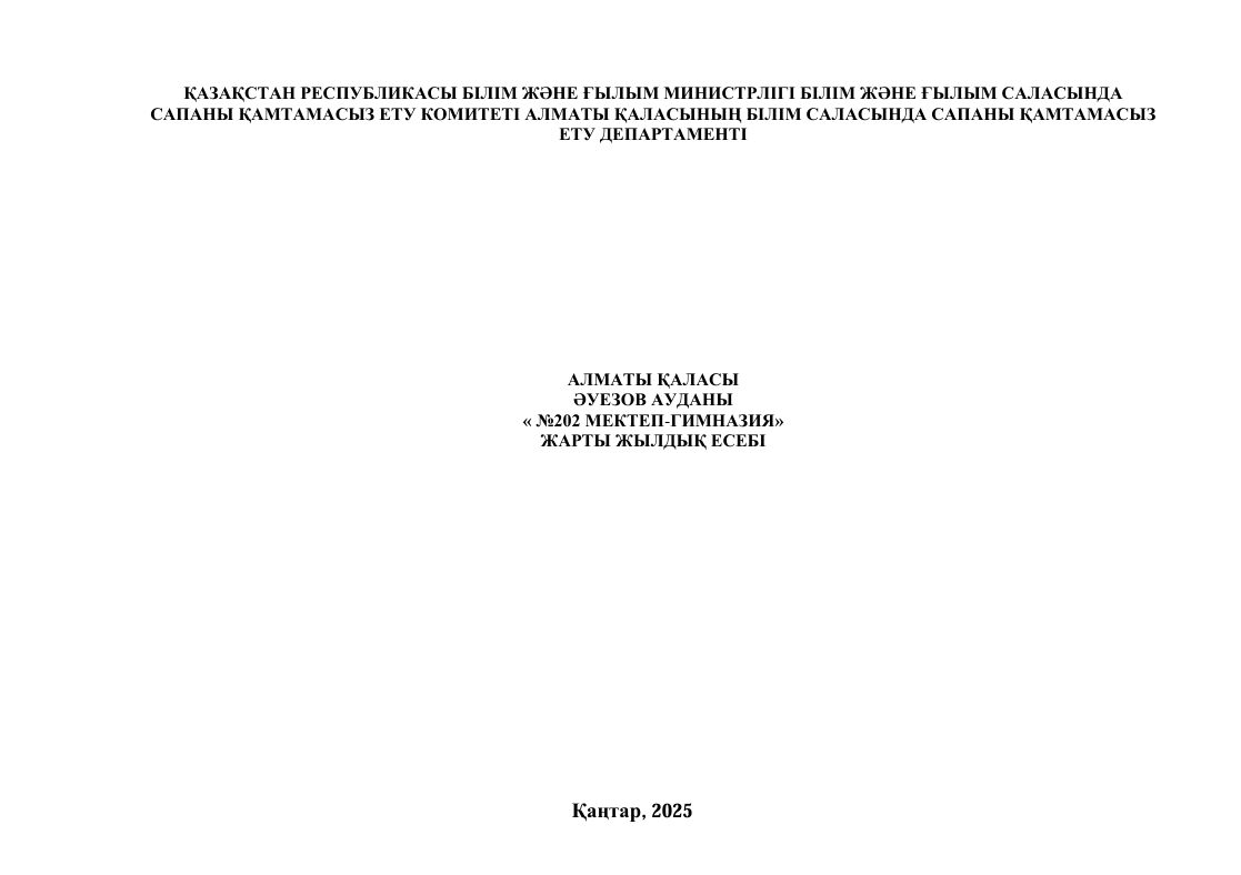 12 март 2025 0 1 2 3 4 5 2024-2025 оқу жылының жартыжылдық есебі АЛМАТЫ ҚАЛАСЫ ӘУЕЗОВ АУДАНЫ « №202 МЕКТЕП-ГИМНАЗИЯ» ЖАРТЫ ЖЫЛДЫҚ ЕСЕБІ2024-2025.pdf [6,14 Mb] (cкачиваний: 0) Посмотреть онлайн файл: 2024-2025.pdf