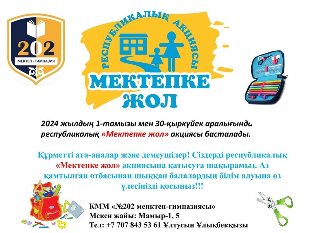 «Мектепке жол» республикалық қайырымдылық акциясына №202 мектеп-гимназия әкімшілігі жүрегі мейірімге толы жақсы жандарды демеушілік жасауға шақырады.