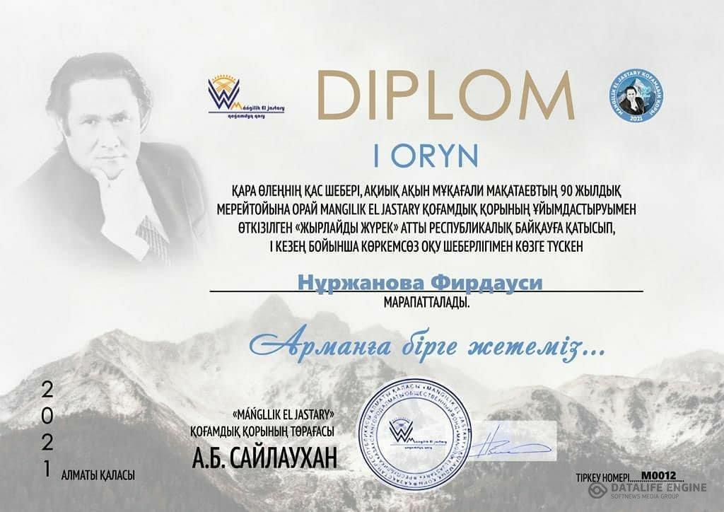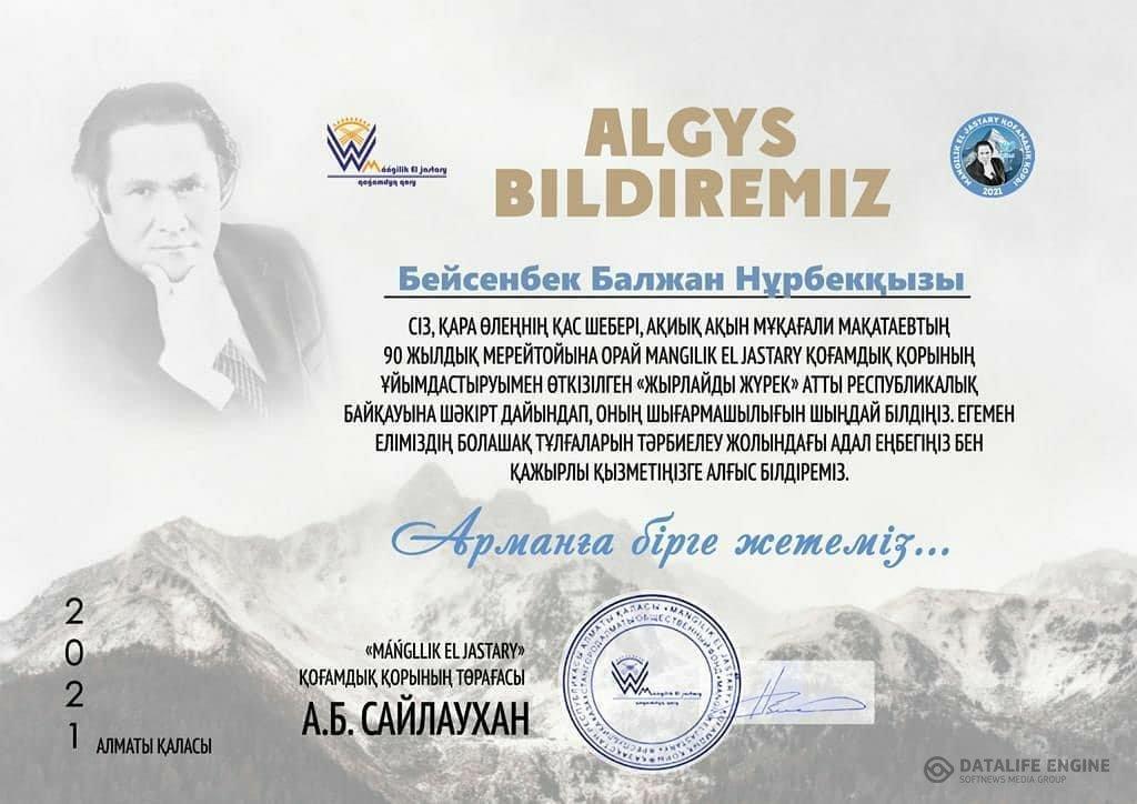 08 февраль 2021 0 1 2 3 4 5 Оқушы жетістігі! Ақиық ақын Мұқағали Мақатаевтың 90 жылдық мерейтойына орай Mangilik El Jastary қоғамдық қорының ұйымдастыруымен өткізілген "Жырлайды Жүрек" атты Республикалық байқауына қатысты.Оқушы: І орын Нұржанова ФирдаусиЖетекшісі: Бейсенбек Балжан