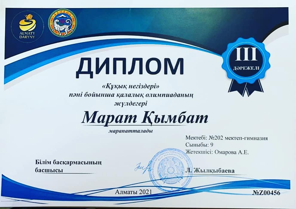 09 апрель 2021 0 1 2 3 4 5 Оқушы жетістігі! Пән бойынша қалалық олимпиаданың жүлдегерлері:1. "Құқық негіздері" ІІІ дәрежелі диплом Марат Қымбат2. "Математика" ІІІ дәрежелі диплом Тиреуова Ақниет