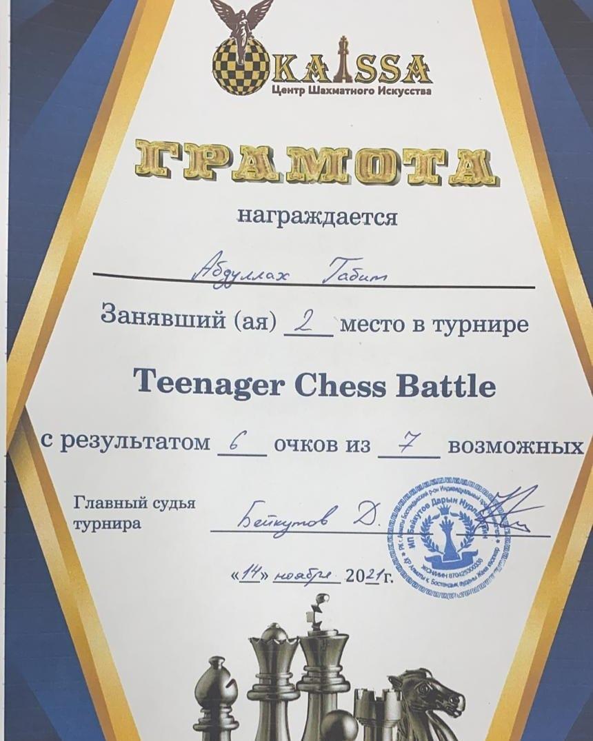 15 ноябрь 2021 0 1 2 3 4 5 Шахмат өнері KAISSA» шахмат өнері орталығының ұйымдастыруымен «Teenager Chess Battle» қалалық турниріне мектебіміздің 9 Г сынып оқушысы Абдуллах Ғабит қатысып,жүлделі II орынға ие болды. Жетекшісі: Райхан Өмірбек.ҚҰТТЫҚТАЙМЫЗ!!!