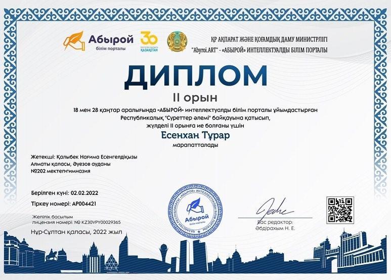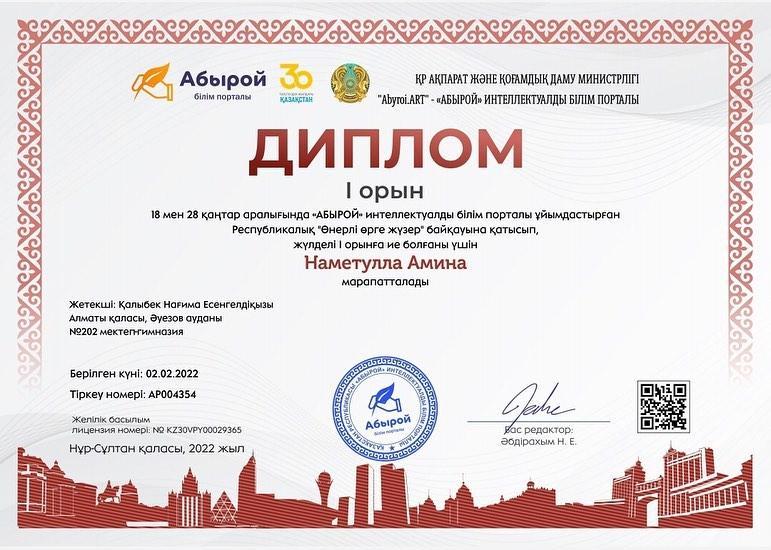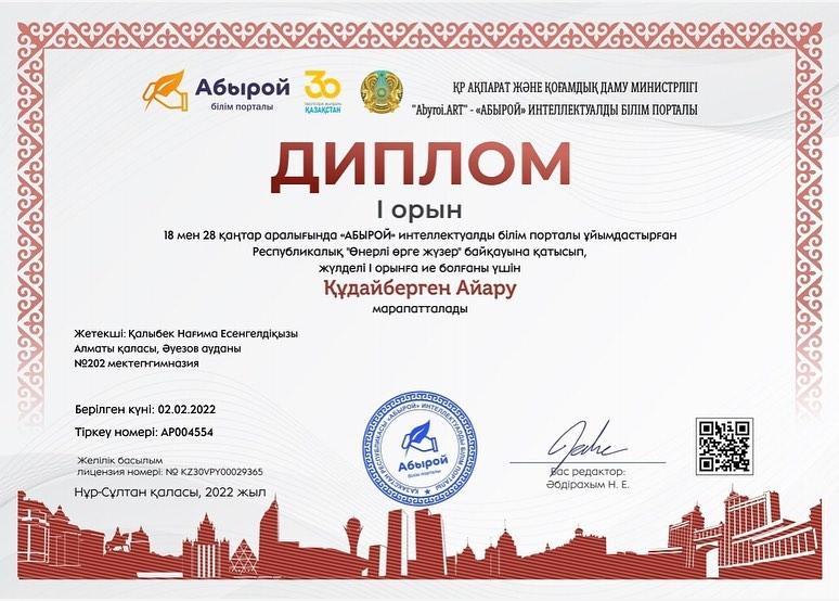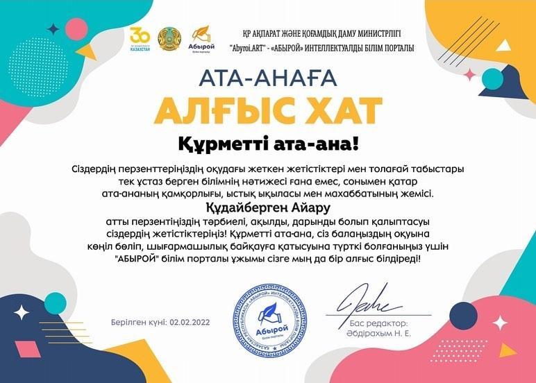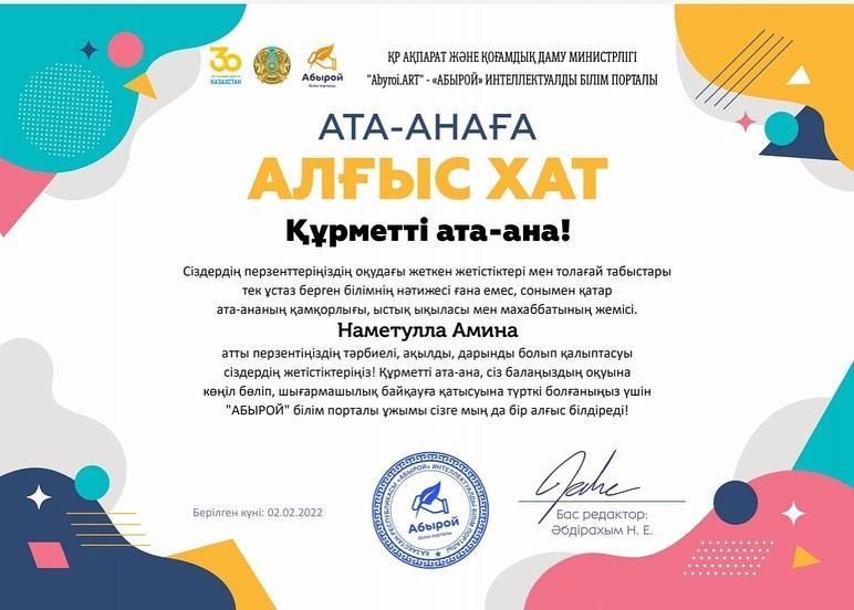 «Аброй» интеллектуалды білім порталы ұйымдастырған Республикалық байқауға 4 «Ә» сынып оқушылары белсенді қатысып, жүлделі орындарды иеленді. Ұстаздары мен ата-аналарына алғыс білдіреміз.