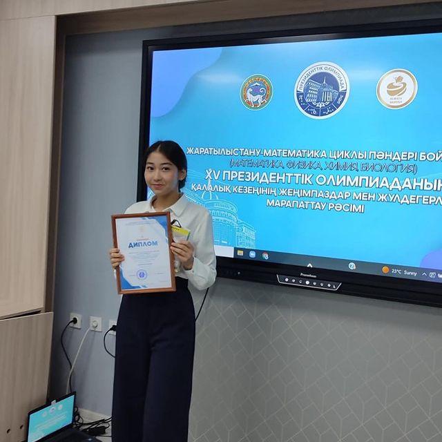 27 қазан күні Республикаға іріктеу тестінен және эссе жазу байқауынан жоғары нәтижемен өтіп, олимпиаданың республикалық кезеңіне Қарағанды қаласына жолдама алған.