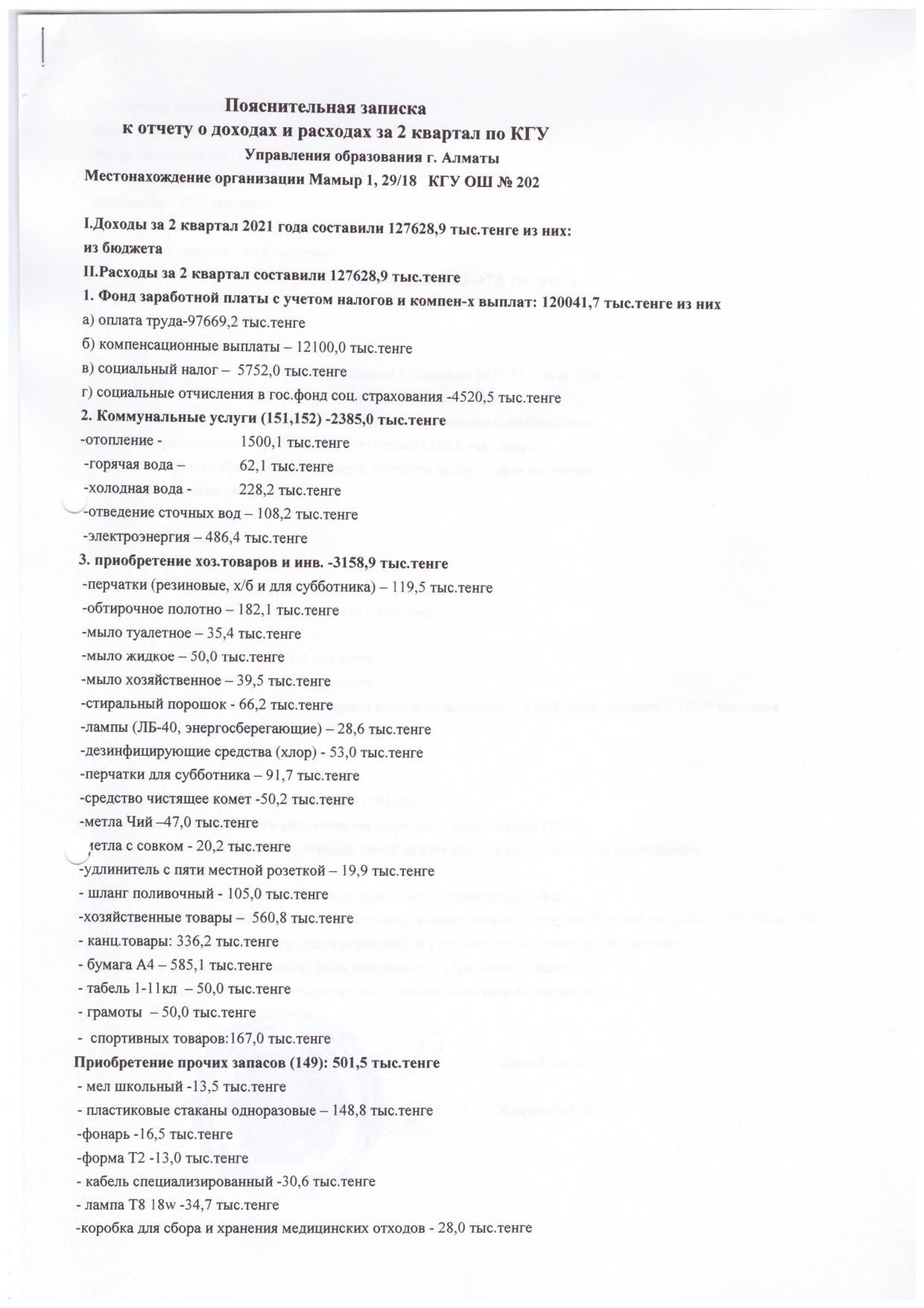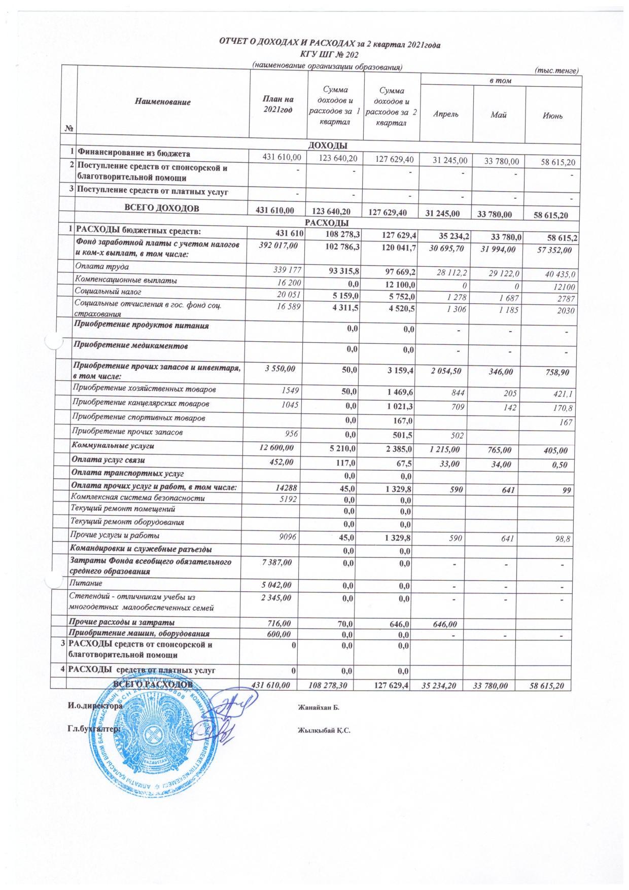 Отчет о доходах и расходах за 2 квартал 2021 год » №202 жалпы білім беретін мектеп