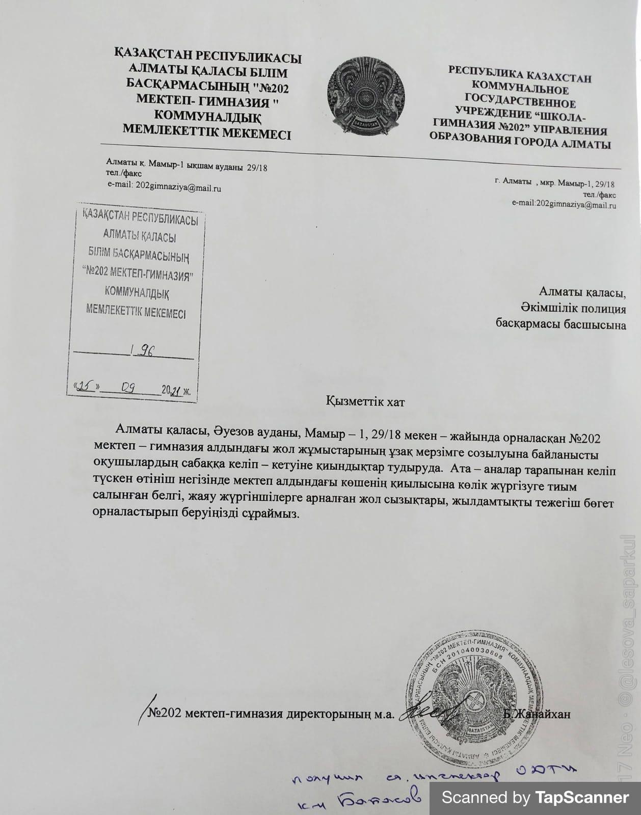Алматы қаласы, Әуезов ауданы, Мамыр-1, 29/18 мекенжайында орналасқан №202 мектеп-гимназияның алдында асфальт төселіп бітті. Жол қозғалыс белгілерін, жаяу жүргіншілерге арналған жол сызықтары, жылдамдықты тежегіш бөгет орналастыру туралы қызметтік хатты Алматы қаласы Әкімшілік полиция басқармасына жолдадық. Жақын уақытты жол белгілерін орналастыраныдығын мәлімдеді.