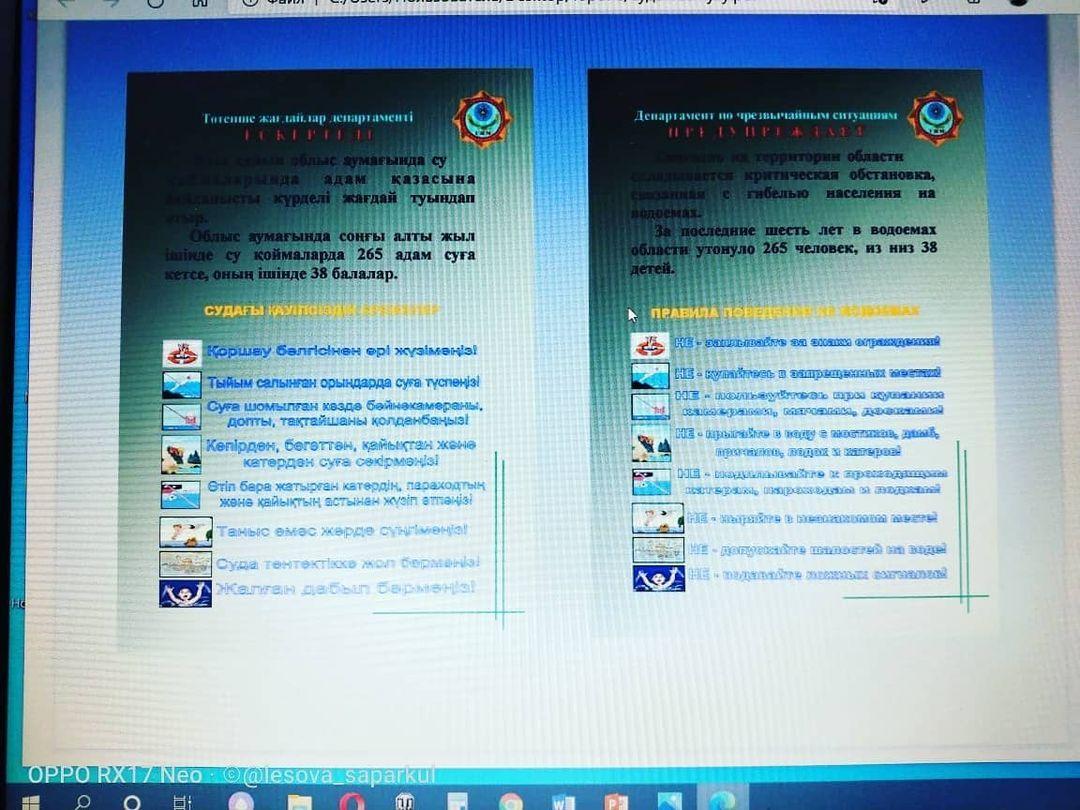 №202 мектеп-гимназияда «Судағы қауіпсіздік ережелерін ұстану» тақырыбында 4-7 сыныптар арасында сынып сағаттары өткізілді. Оқушыларға суда жүзу барысында қауіпсіздік ережелері туралы бейнебаян көрсетіліп, суда өзін-өзі ұстау тәртібі адамның өмірі үшін маңызды болып табылатынын және әрқашан есімізде ұстауға тиісті осы қауіпсіздік ережелерін сақтау туралы таныстырылым көрсетілді.