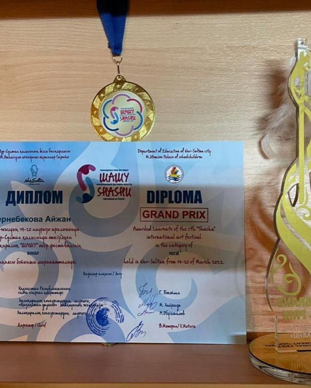 2022 жылдың наурыз мерекесінің қарсаңында Нұр-Сұлтан қаласында өткізілген халықаралық “Шашу” өнер фестивальінің ВОКАЛ номинациясы бойынша Grand prix иегері атанған 10 “В”сынып оқушысы Пернебекова Айжан. Құттықтаймыз👏👏👏