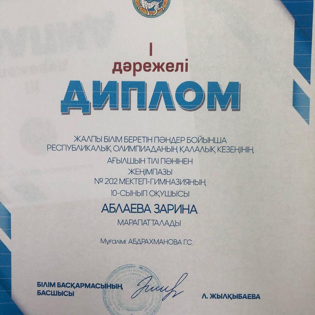 20 апрель 2022 0 1 2 3 4 5 Республикалық олимпиаданың қалалық кезеңінің ағылшын тілі пәнінен жеңімпазы 10 “Ә”сынып оқушысы Аблаева Зарина І дәрежелі диплом иегері атанды. Құттықтаймыз👏👏👏
