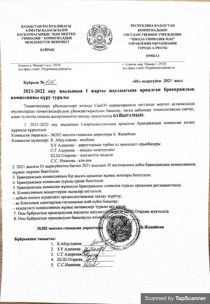 Бракераждық комиссия құру туралы бұйрық 2021-2022 оқу жылы » №202 жалпы білім беретін мектеп