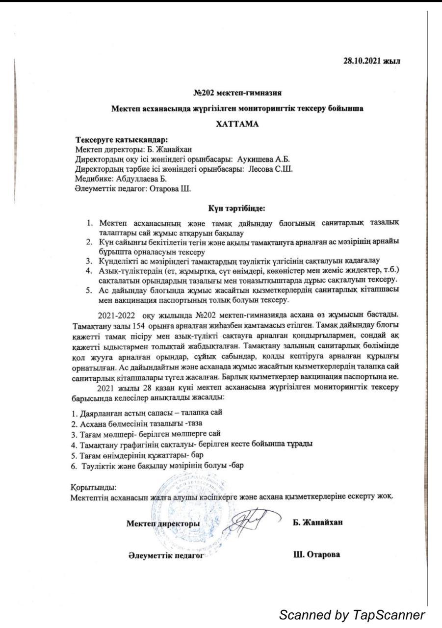 Бракераждық комиссиямен жүргізілген мониторинг хаттамасы 28.10.2021 ж. » №202 жалпы білім беретін мектеп