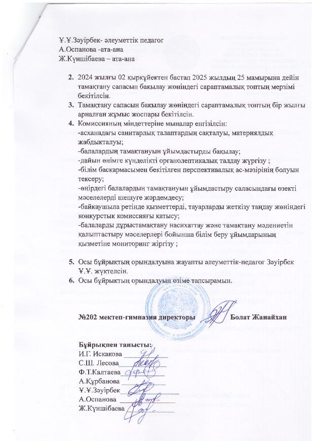 2024-2025 оқу жылында құрылған тамақтану сапасын бақылау тобы » №202 жалпы білім беретін мектеп