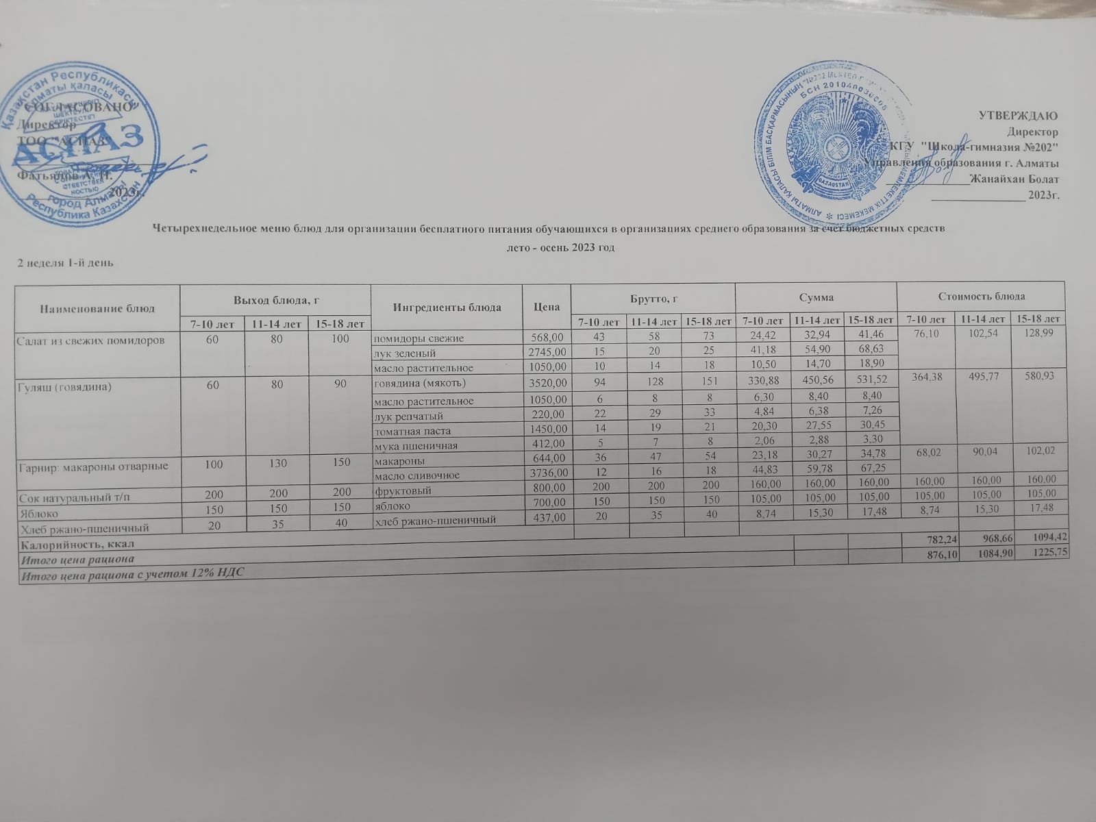 2023-2024 оқу жылындағы II-апта 1-күнгі ас мәзірі » №202 жалпы білім беретін мектеп