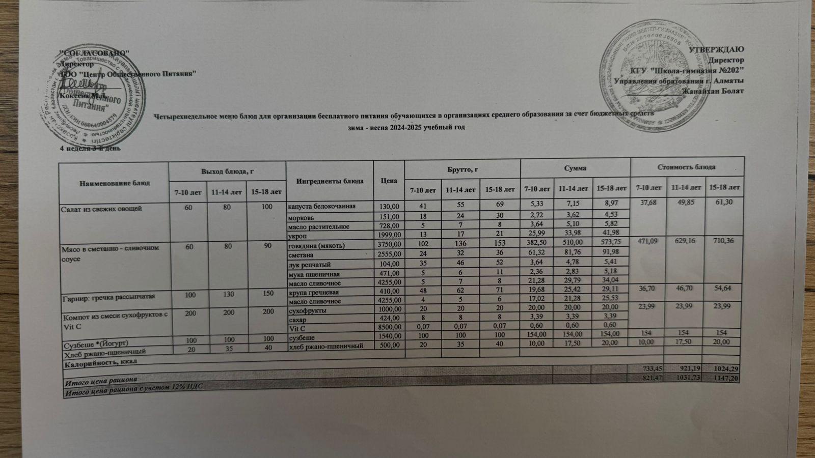 2024-2025 оқу жылындағы 21 мамыр күніне берілген ас мәзірі » №202 жалпы білім беретін мектеп